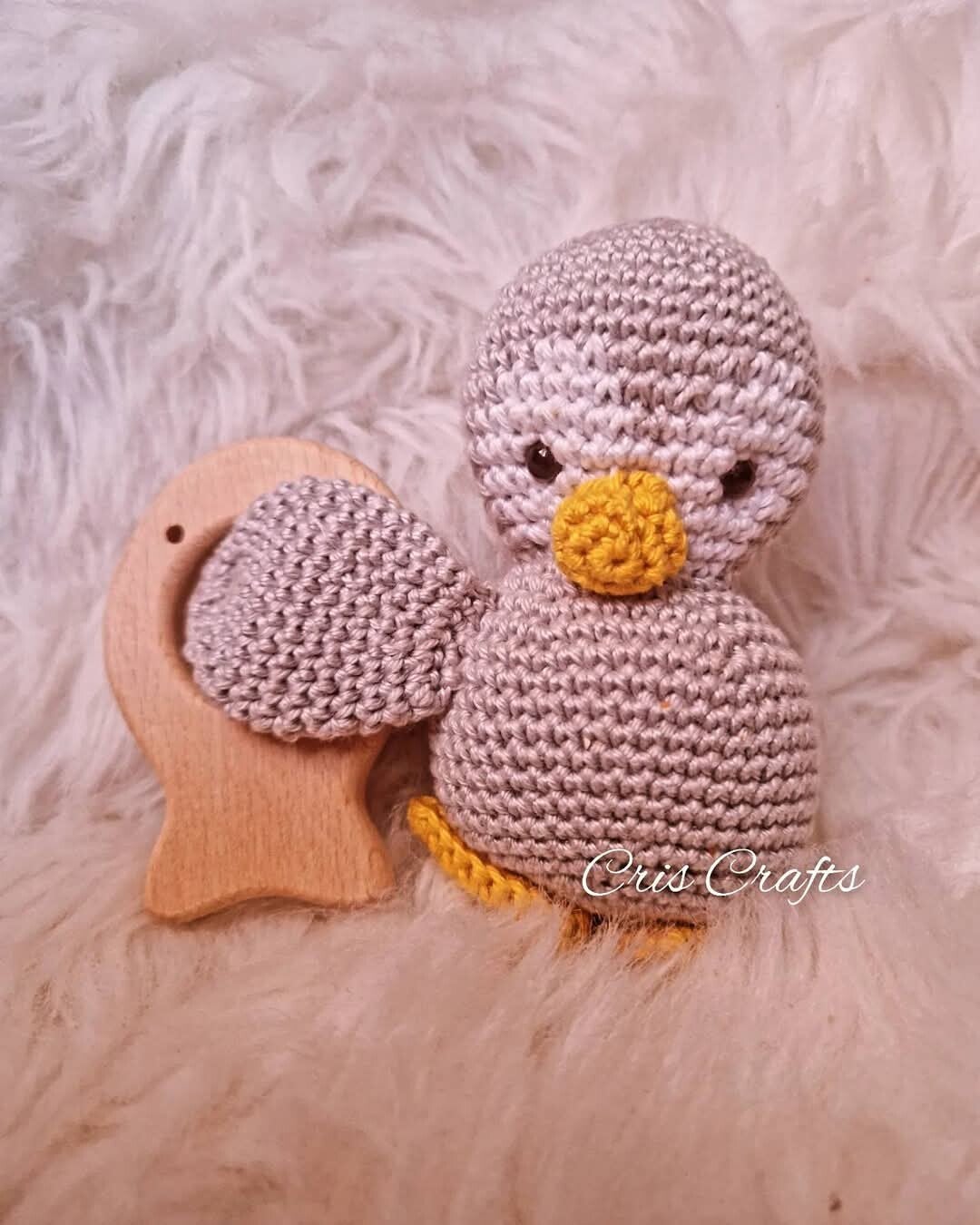 Gehaakt van 100% katoen. Voorzien van een rammelkraal wat zorgt voor een leuk geluidseffect en stimuleert de hand/oog coördinatie.
